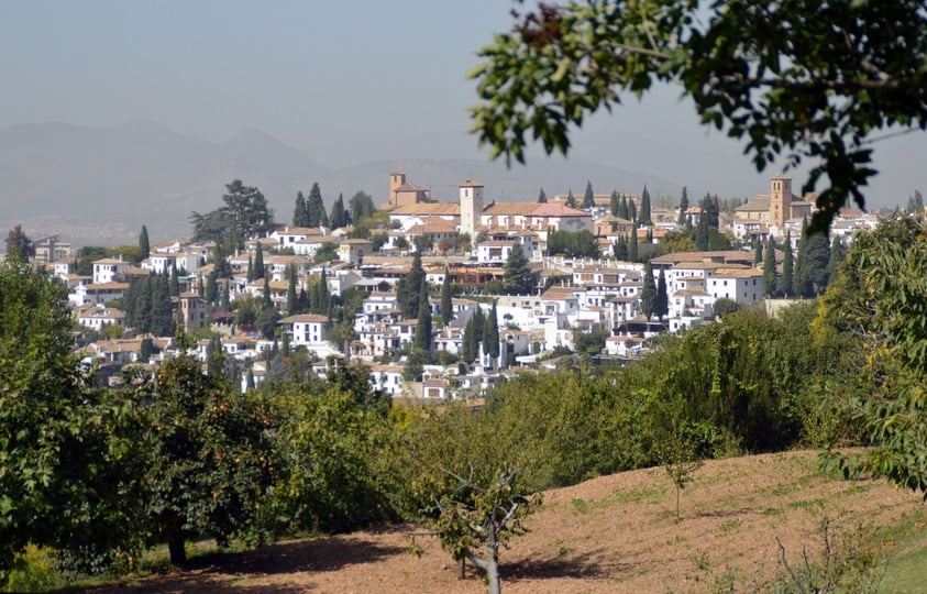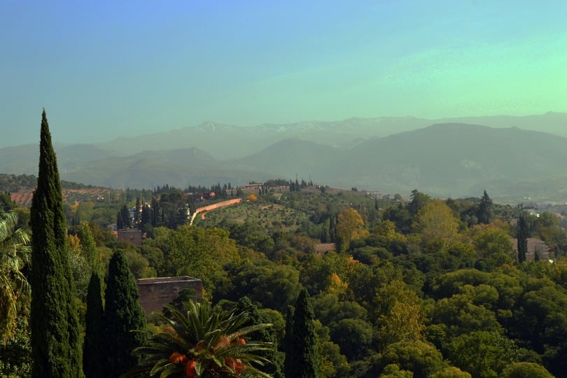 Vanaf het hoogste punt heb je uitziocht zowel op een groene wereld als ook op de oude binnenstad van Granada.