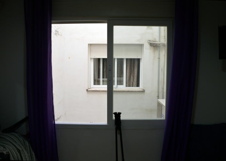 Veel kamers, zo ook de onze, hadden uitzicht op deze "binnenplaats". Nou ja om de preis kun je ook niet meer verwachten. Voor het raam staan de walking stokken van Barbara.